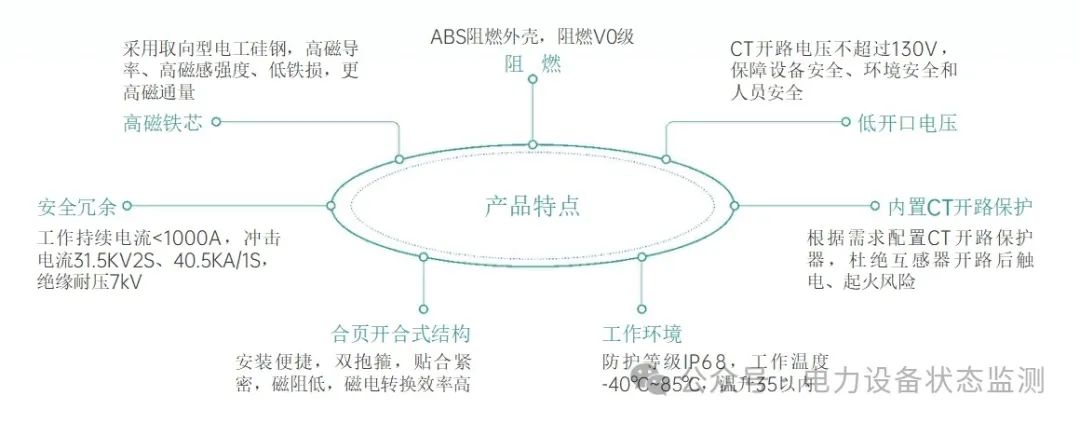 取電互感器采用IP68級防水、鐵芯納米層防銹及V0級阻燃設(shè)計,內(nèi)置專業(yè)型開路保護(hù)器(保護(hù)啟動后電壓有效值Vrms<2V),大電流容量設(shè)計讓額定滿載電流時溫升≤35℃,保障了現(xiàn)場的安全便捷安裝及長期無憂的安全穩(wěn)定運行。